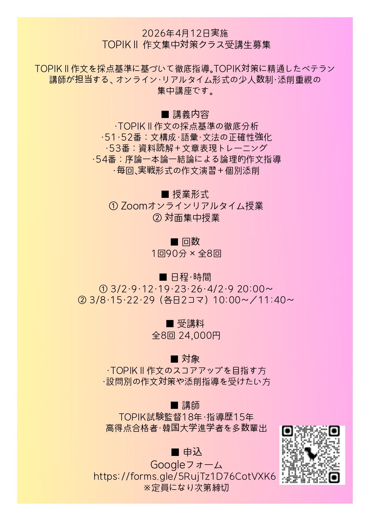 TOPIK Ⅱ 作文集中対策クラス受講生募集